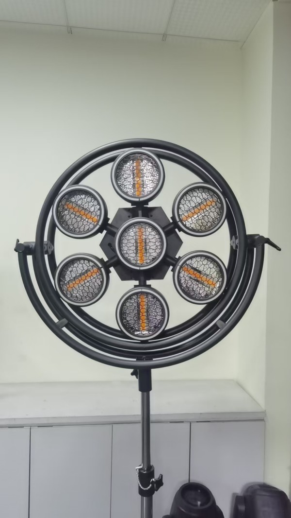 Light source: 112pcs 5050 three colors LED + 21pcs led strip -30pcs of each one。7pcs*60w warm white COB LED.